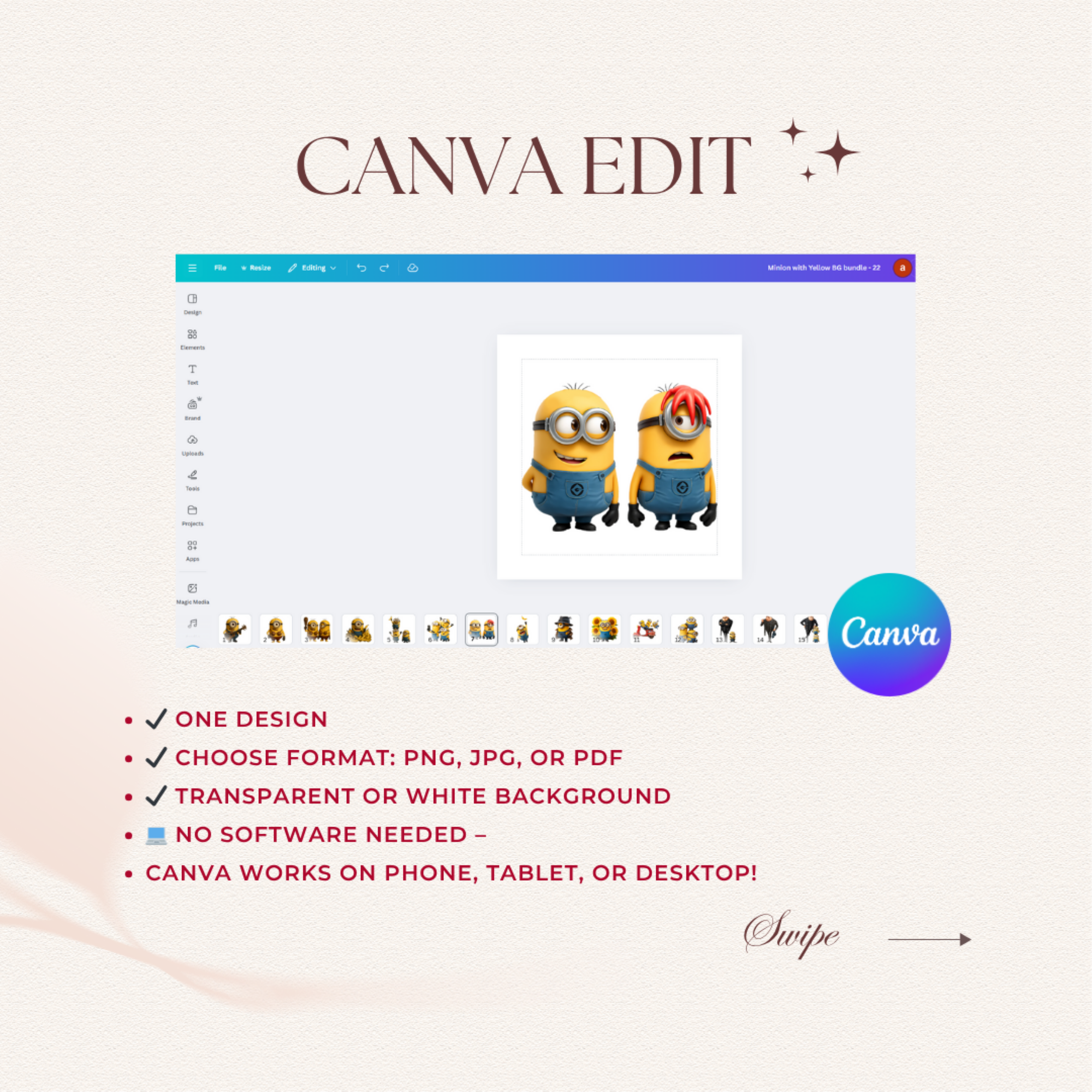 This massive digital collection features over 100 unique and funny designs of everyone's favorite Minions, along with Gru and other characters. From classic poses to holiday-themed art, this bundle is perfect for adding fun to all your creative projects, including apparel, party supplies, and more.
