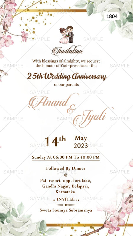 The floral Theme of the 25th Wedding anniversary ceremony is a digital invitation Canva Editable Template on white background color. This Silver Jubilee 25th anniversary e-invite is available in the English language. This marriage anniversary invitation card includes elements such as frame, pink flowers, green flowers, stylish couple doodle, and glitter. This card design can be customized online for free in Canva, and you can edit the couple's name, date, time, function name and venue. You can also share your card easily via WhatsApp or email.