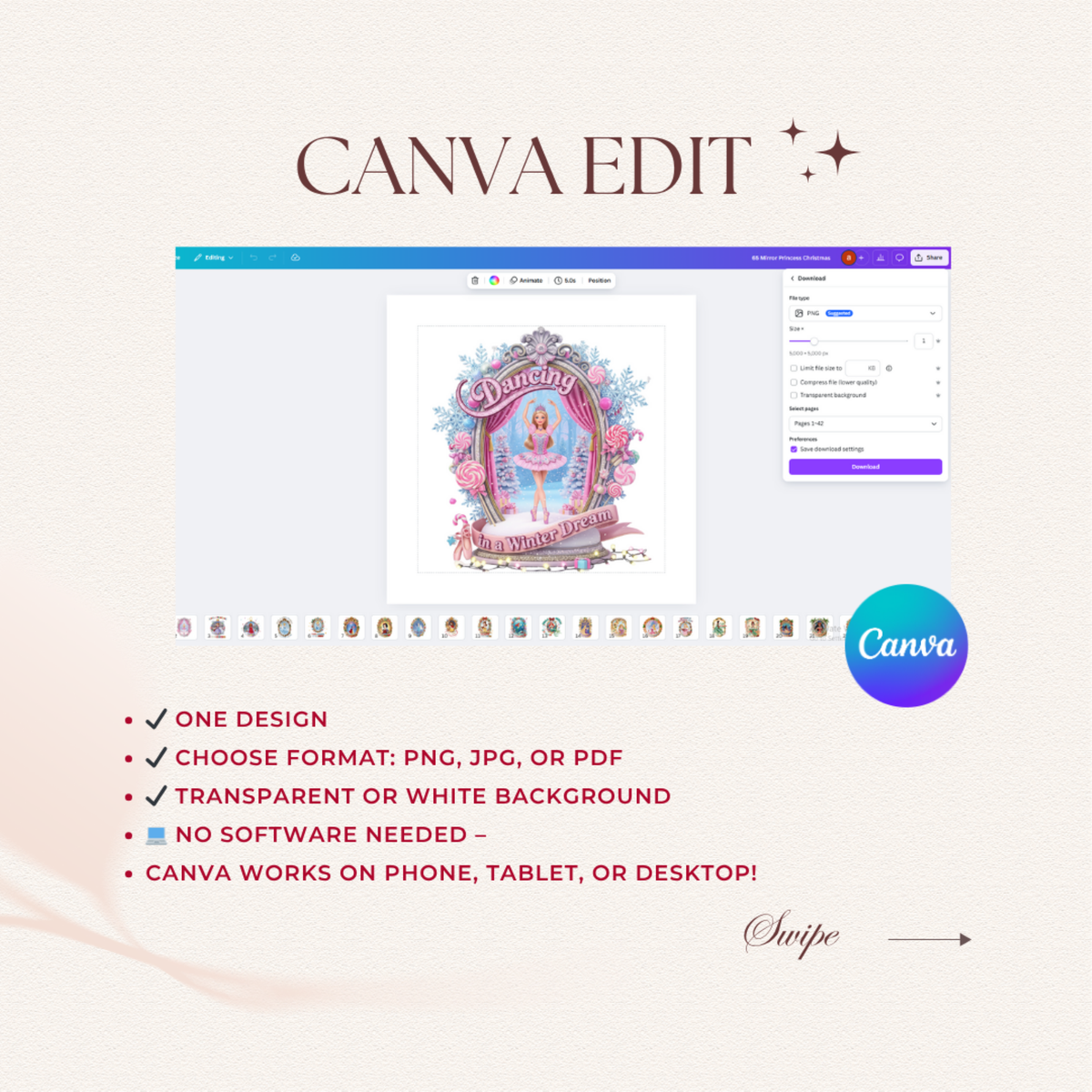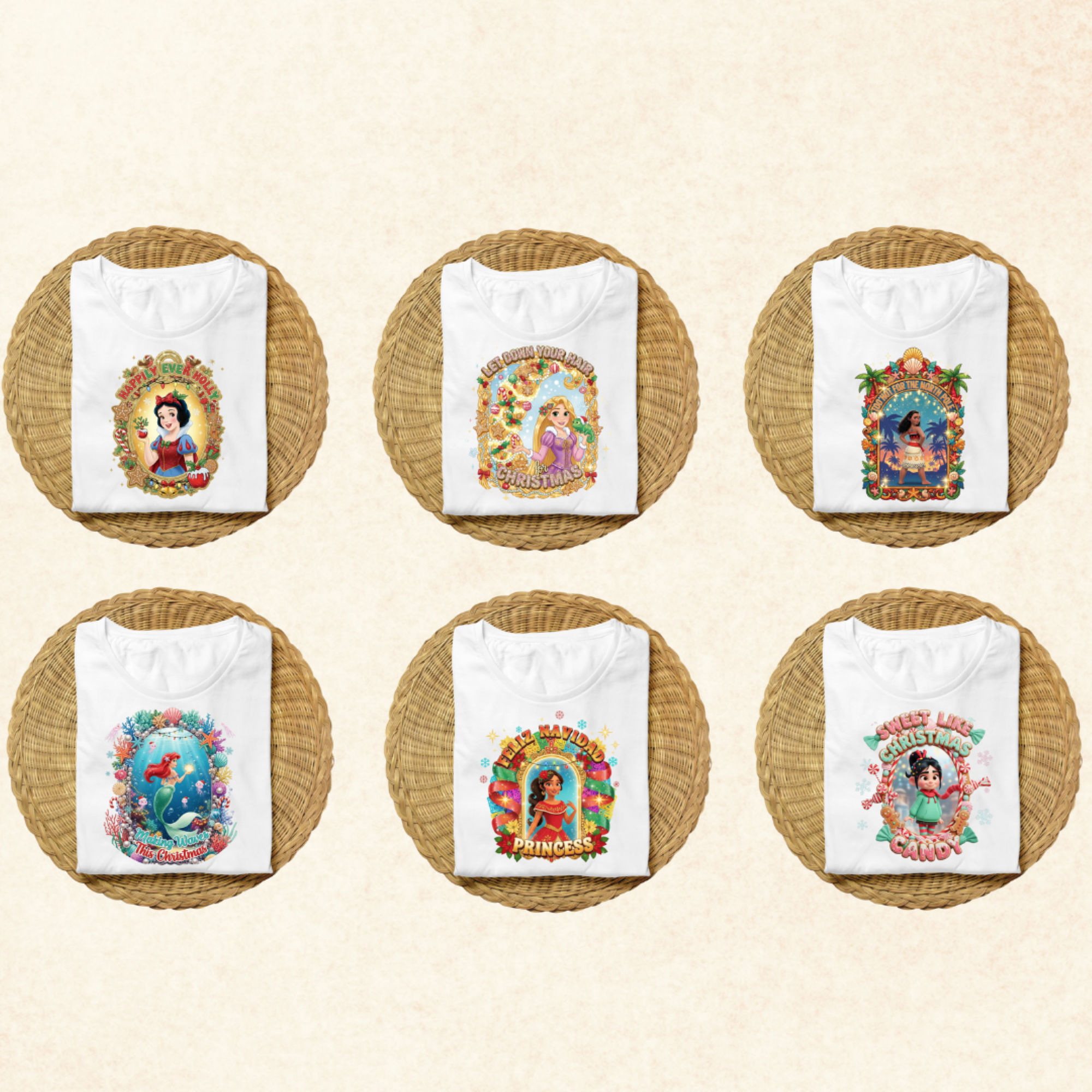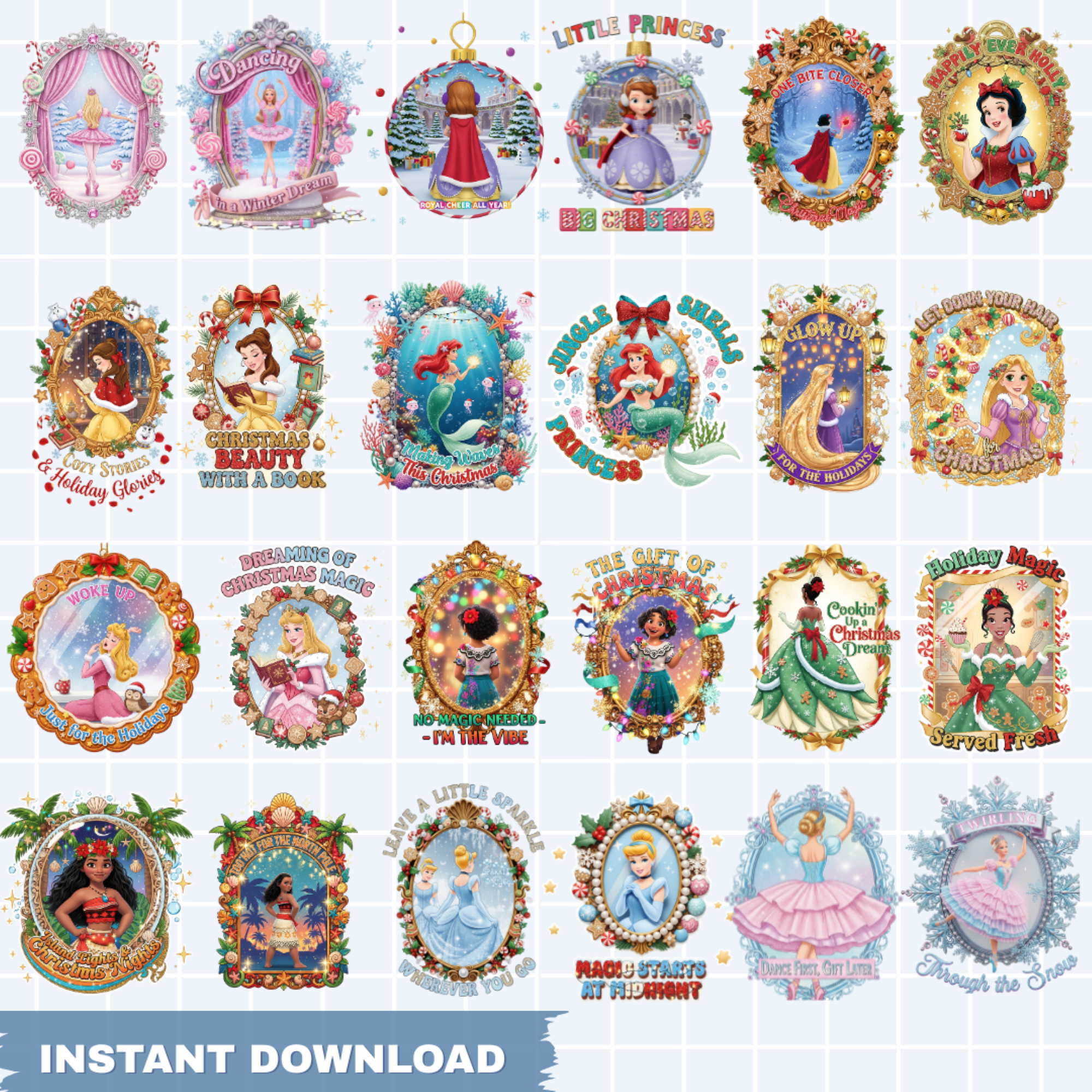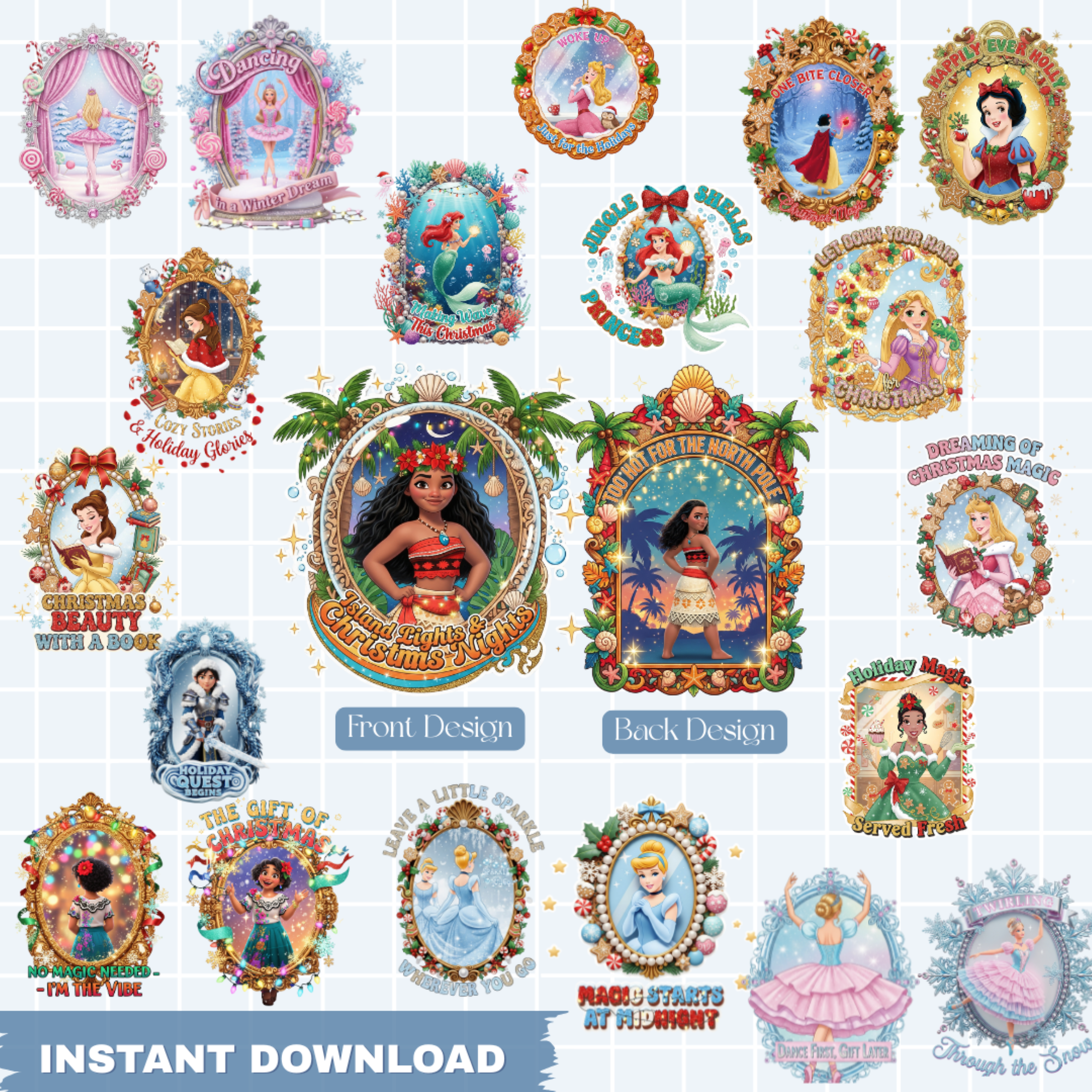 This enchanting digital collection is packed with 40 unique designs featuring your favorite princesses in beautiful, ornate frames with holiday-themed elements. Perfect for adding a magical touch to your seasonal projects, this bundle is ideal for creating custom apparel, gifts, and decorations.