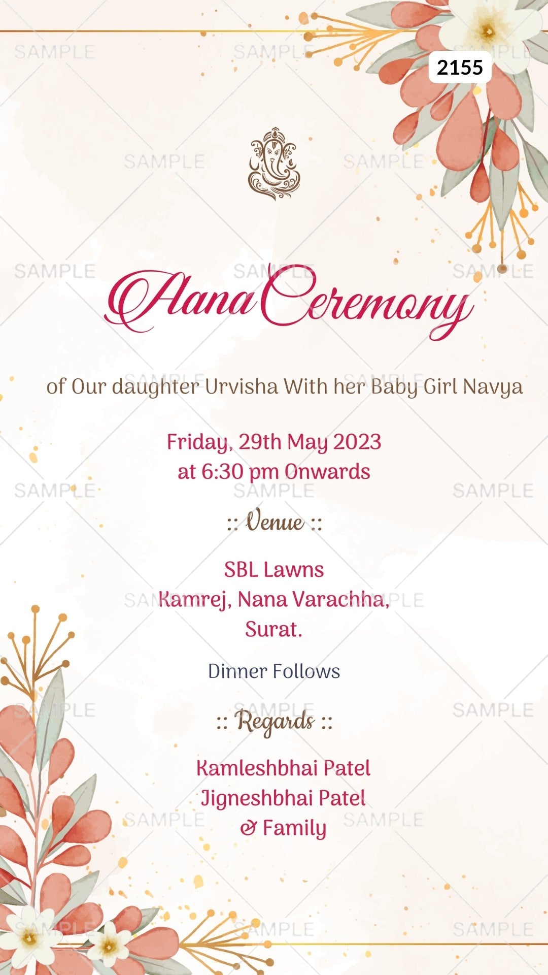 Aana ceremony invitation card Canva Editable Template in english language with flowers, leaves as floral theme design 2155