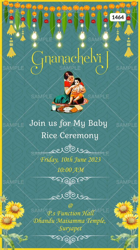 The minimalistic Theme of the Annaprashan ceremony digital invitation Canva Editable Template is in cyan background color. This Rice ceremony e-invite editable template is available in the English language. This annaprasana sanskar ceremony includes elements such as sunflowers, rice feeding doodle, bells, marigold garland, lamps, and frame. This card design can be customized online for free in Canva, and you can edit the name, date, time, function name and venue. You can also share your card easily via WhatsApp or email.