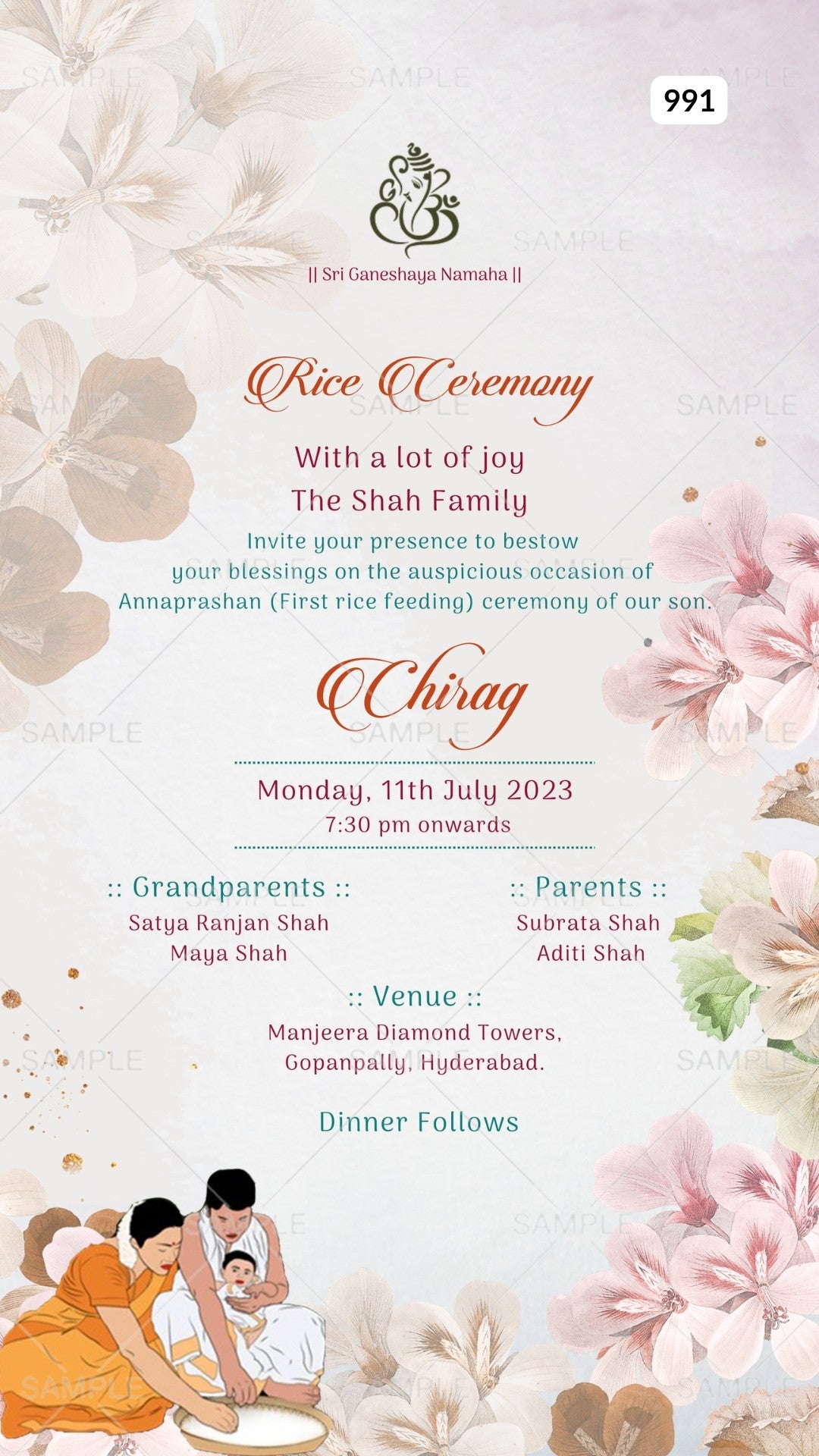 Annaprashan ceremony invitation card Canva Editable Template in english language with rice feeding doodle, flowers as floral theme design 991