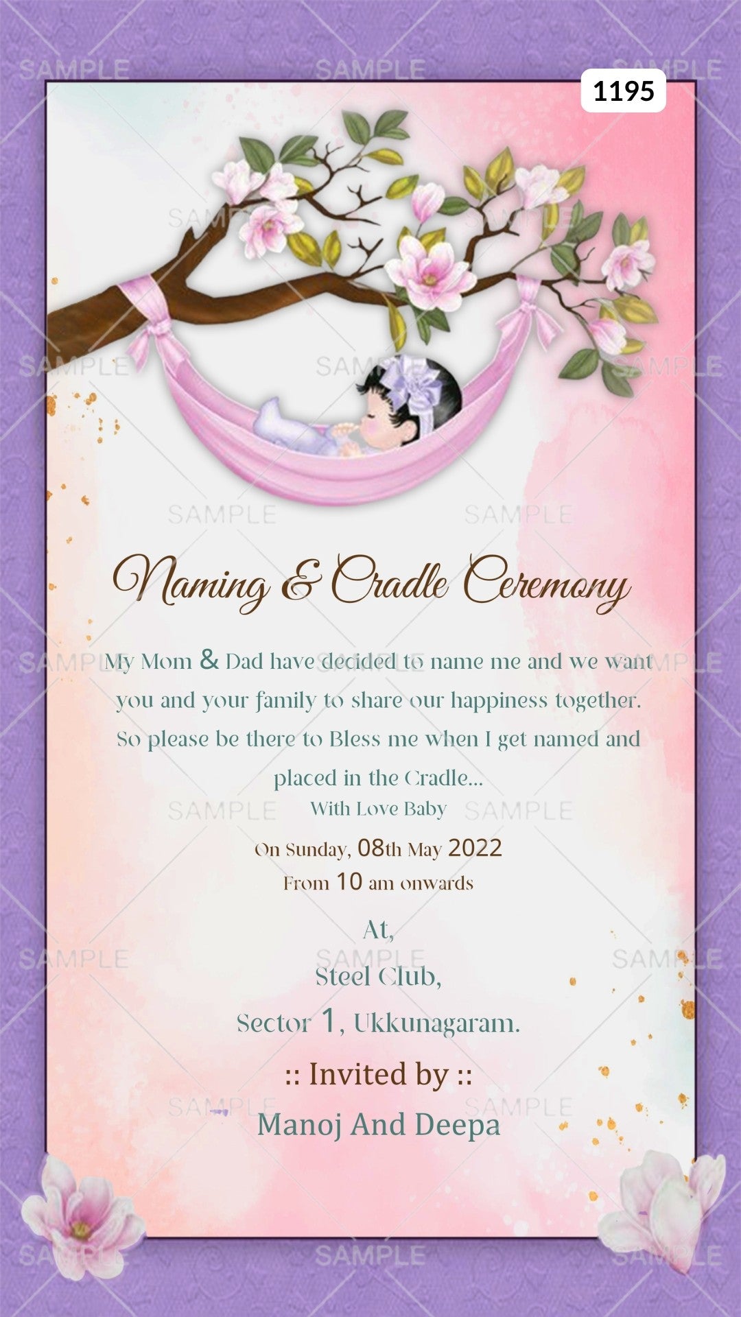The floral theme of the Hindu South Indian Family Naming and Cradle Ceremony Digital Invitation Canva Editable Template is blush pink and purple background colors. This e-invite card is perfectly suitable for Tamil families and is available in the English language. It includes elements such as a flower and a baby in the hanging swing. This card design can be customized online for free in Canva, and you can edit the function name, girl name, date, time, venue, and regards. You can also share your card easily via WhatsApp or email.