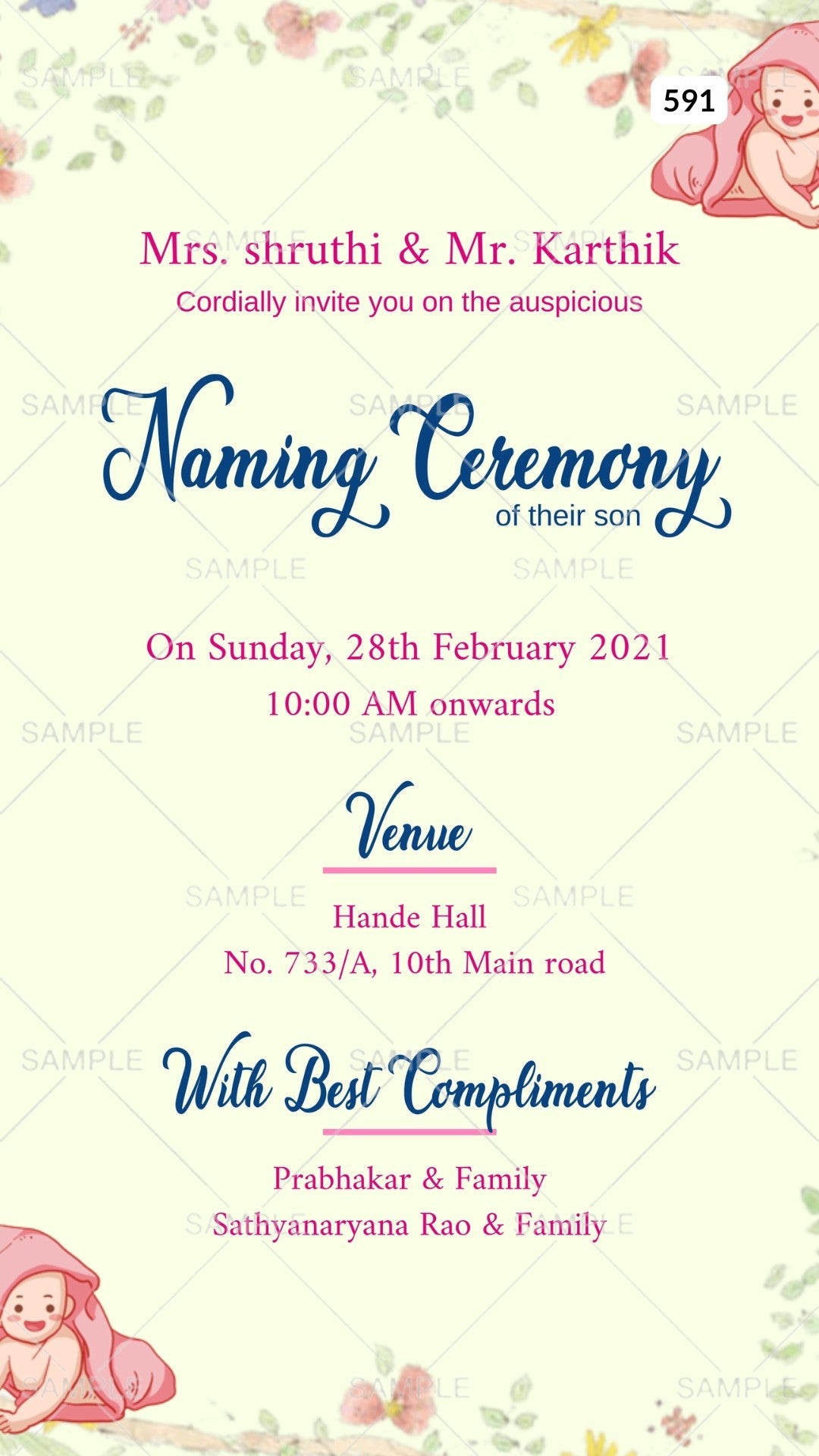 Baby Naming ceremony invitation card Canva Editable Template in english language with baby doodle, leaves as floral theme design 591