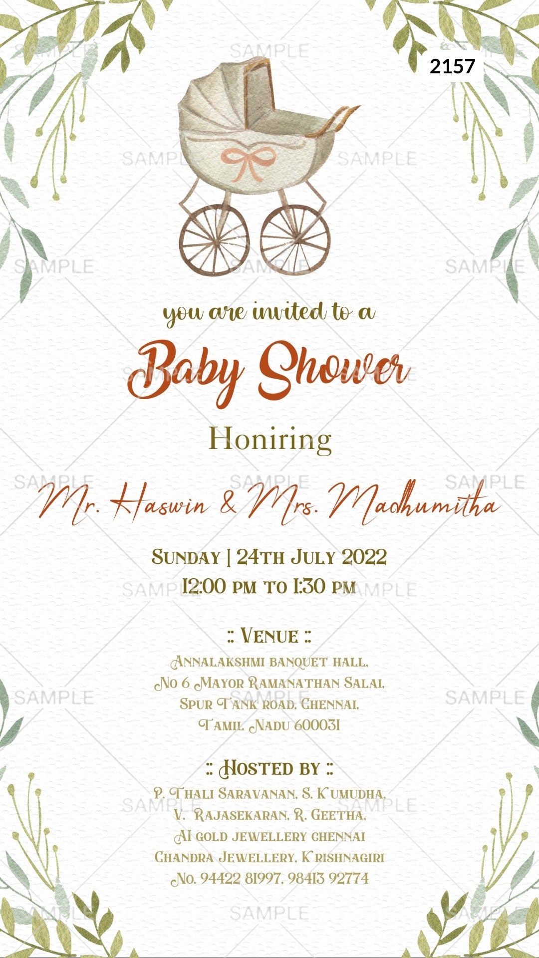 The artistic leaves Theme of the Baby Shower ceremony digital invitation Canva Editable Template in the white background color. This e-invite Editable Template is available in English language. It includes elements such as baby roller, and green leaves. This Editable Template design can be customized online for free in Canva, and you can edit the function name, date, time, venue, and regards. You can also share your card easily via WhatsApp or email.