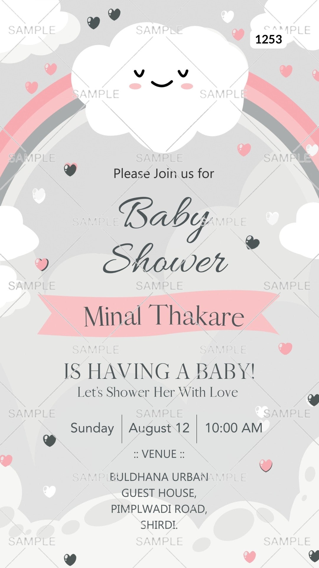 The cloudy Theme of the Baby Shower ceremony digital invitation Canva Editable Template in gray background color. This e-invite Editable Template is available in English language. It includes elements such as rainbow, heart, and cloud. This Editable Template design can be customized online for free in Canva, and you can edit the function name, date, time, venue, and regards. You can also share your card easily via WhatsApp or email.