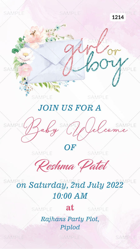 The floral theme of the Hindu-Indian family Baby Welcome Digital Invitation Canva Editable Template in baby pink background color. This e-invite card is perfectly suitable for Gujarati families and is available in the English language. It includes elements such as flowers, envolpment, This card design can be customized online for free in Canva, and you can edit Function Name, Girl or Boy Name, Date, Time, Venue, etc. You can also share your card easily via WhatsApp or email.