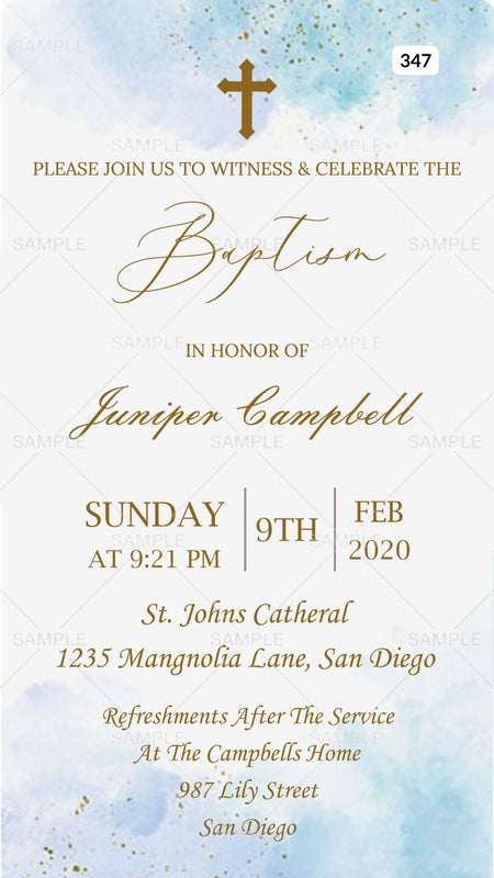 The glittery Theme of the Catholic Baptism ceremony digital invitation Canva Editable in white, blue splash background color. This christening ceremony e-invite editable template is available in the English language. This baptism ceremony includes elements such as glitter and a christian cross symbol. This card design can be customized online for free in Canva, and you can edit the name, date, time, function name and venue. You can also share your card easily via WhatsApp or email.