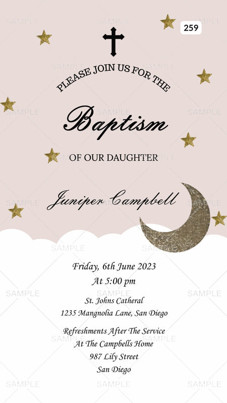 Baptism ceremony invitation card Canva Editable Template in english language with moon, star as minimalistic theme design 259