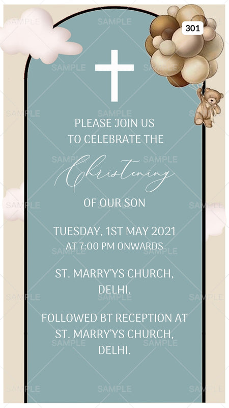 Baptism ceremony invitation card Canva Editable Templatein english language with balloons, cloud as playful theme design 301
