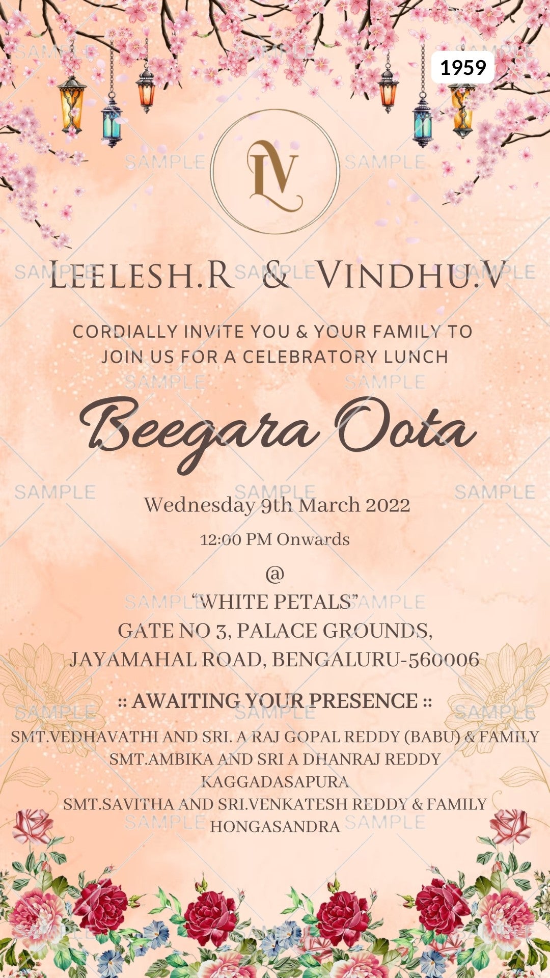 Beegara oota invitation card Canva Editable Template in english language with couple logo, lantern as floral theme design 1959