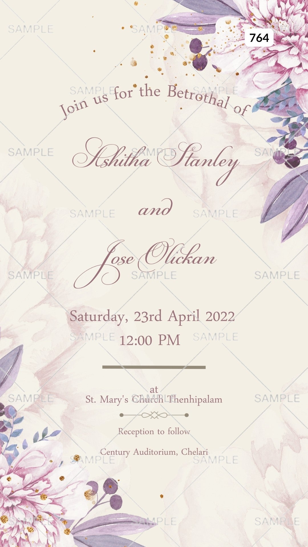 The floral Theme of the Catholic Betrothal ceremony digital invitation Canva Editable for catholic family in light cream background color. This Betrothal ceremony e-invite editable template is available in the English language. This engagement invitation includes elements such as purple leaves, pink flowers, and glitter. This card design can be customized online for free in Canva, and you can edit the couple's name, date, time, function name and venue. You can also share your card easily via WhatsApp or email.