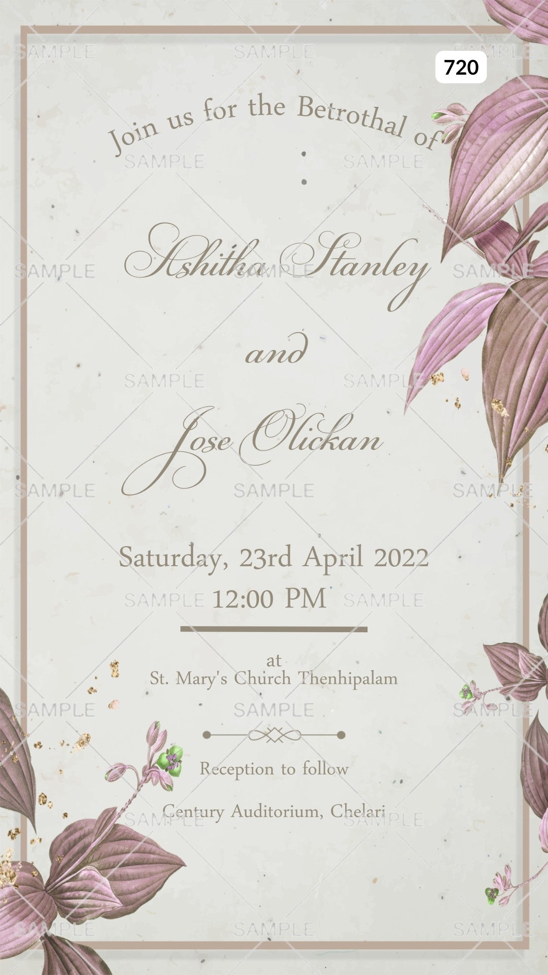 Betrothal ceremony invitation card Canva Editable Template for Catholic family in english language with leaves, frame as minimalistic theme design 720