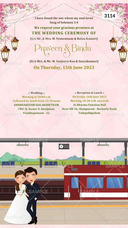 The love story Theme of the bible verse Christian digital invitation Canva Editable Template for a church wedding ceremony in pink background color. This e-invite editable template is perfectly suitable for Catholic families and it's available in English language. It includes elements such as a couple doodle, a bench, a lantern, pink flowers, a train, a clock, and string lights. This card design can be customized online for free in Canva, and you can edit the couple's name, function name, date, time, venue, and regards. You can also share your card easily via WhatsApp or email.