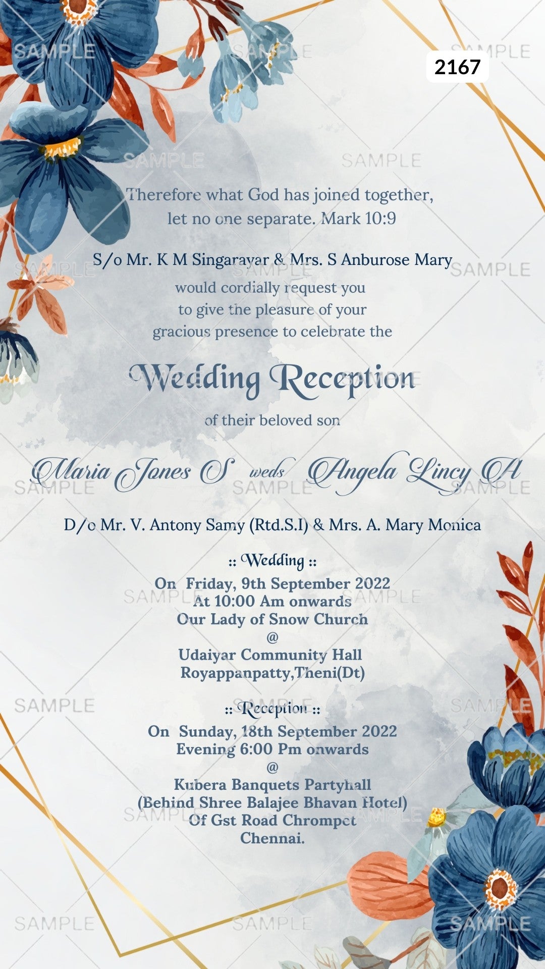 The Artistic flowers Theme of the bible verse Christian digital invitation Canva Editable Template for a church wedding ceremony in grey splash background color. This e-invite editable template is perfectly suitable for Catholic families and it's available in English language. It includes elements such as Golden lines, blue flowers, and brown leaves. This card design can be customized online for free in Canva, and you can edit the couple's name, function name, date, time, venue, and regards. You can also share your card easily via WhatsApp or email.