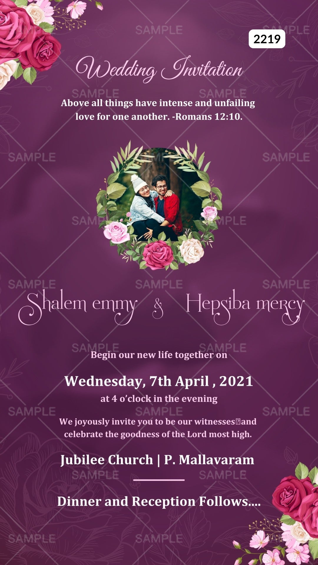 The couple photo floral Theme of the bible verse Christian digital invitation Canva Editable Template for a church wedding ceremony in purple background color. This e-invite editable template is perfectly suitable for Catholic families and it's available in English language. It includes elements such as couple photo, pink flowers, red flowers, green leaves, and flower patterns. This card design can be customized online for free in Canva, and you can edit the couple's name, function name, date, time, venue, and regards. You can also share your card easily via WhatsApp or email.