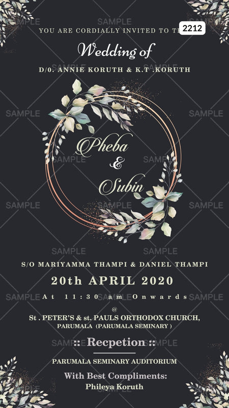 The minimalistic Theme of the bible verse Christian digital invitation Canva Editable Template for a church wedding ceremony in grey background color. This e-invite editable template is perfectly suitable for Catholic families and it's available in English language. It includes elements such as golden rings, green leaves, and glitter. This card design can be customized online for free in Canva, and you can edit the couple's name, function name, date, time, venue, and regards. You can also share your card easily via WhatsApp or email.