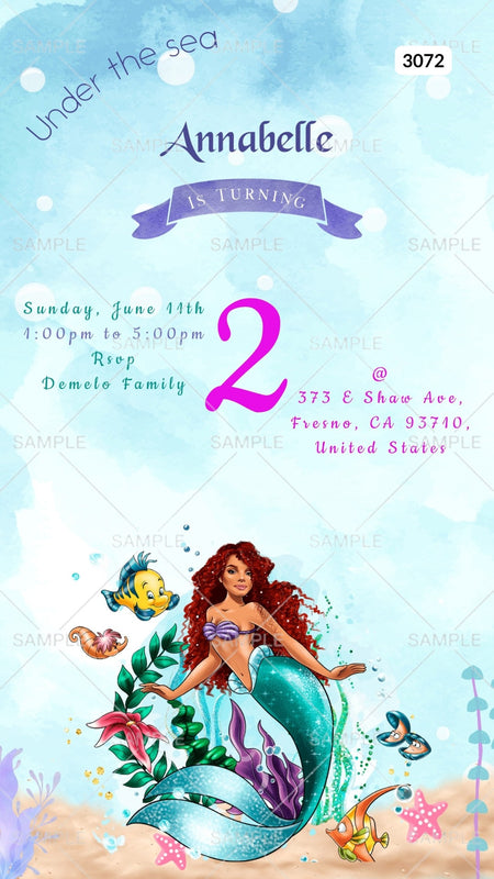 Birthday party invitation card by canva for girl in English language with Under the Sea theme Canva Editable Template design 3072