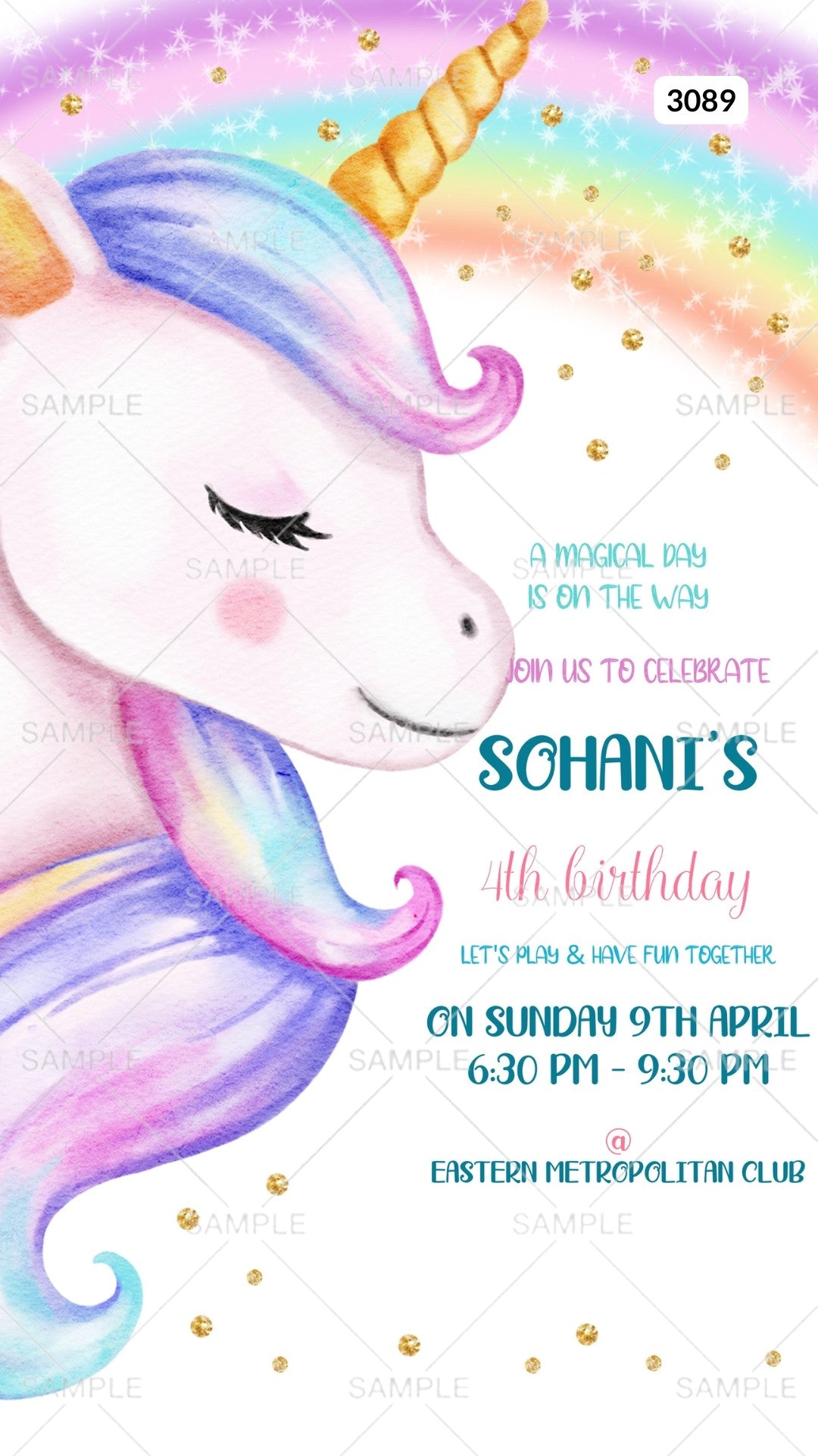 Birthday party invitation card by canva for girl in English language with unicorn as rainbow theme Canva Editable Template design 3089