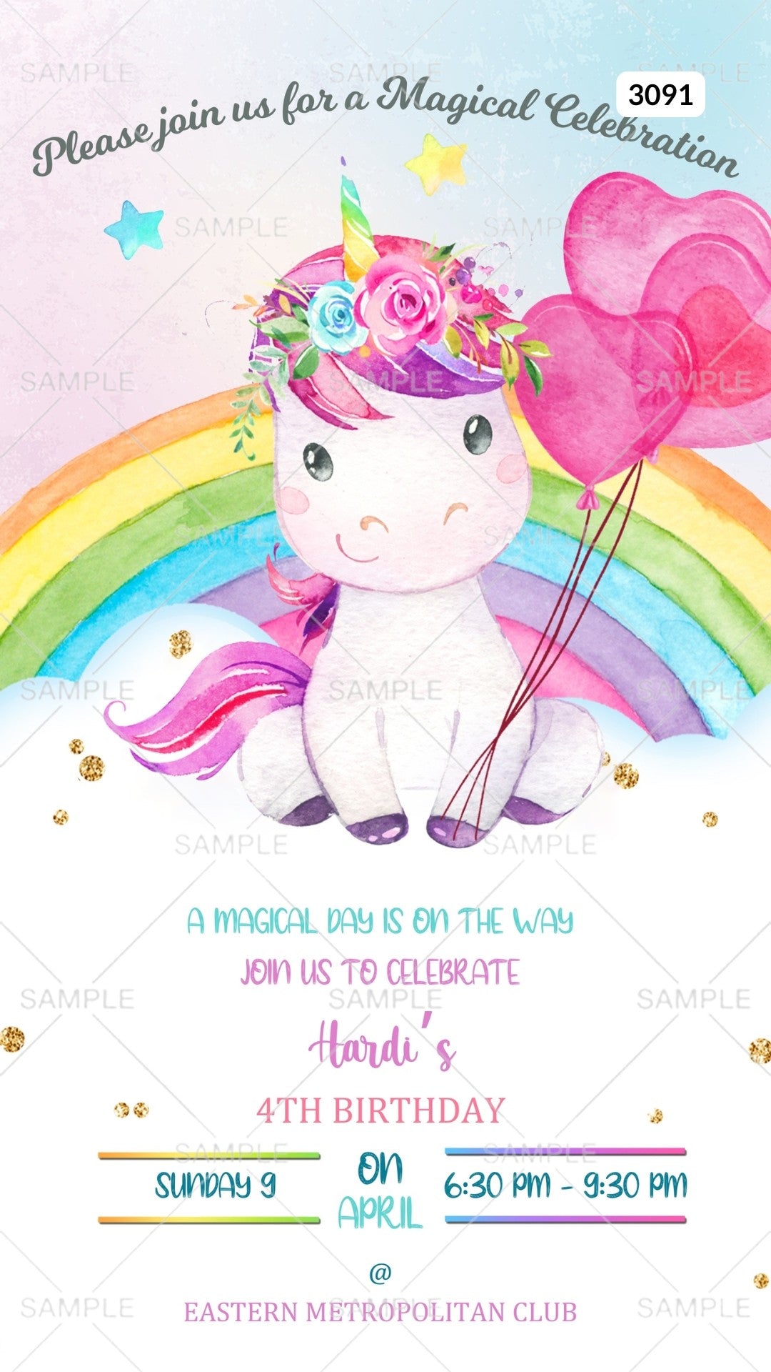 Birthday party invitation card by canva for girl in English language with unicorn theme Canva Editable Template design 3091