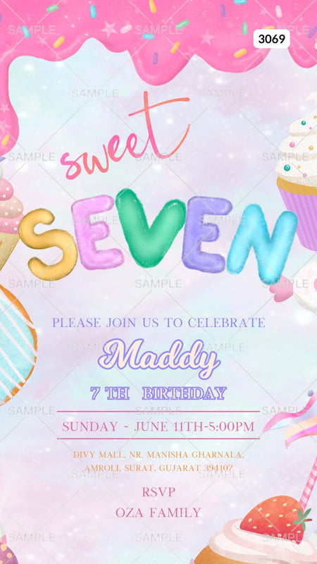 The candy Theme of the 7th Birthday party digital invitation Editable Canva Template in purple background color. This birthday party e-invite editable template is available in the English language. Happy birthday, the invitation includes elements such as cup cake, donut, and strawberry. This card design can be customized online for free in Canva, and you can edit the name, date, time, function name and venue. You can also share your card easily via WhatsApp or email.