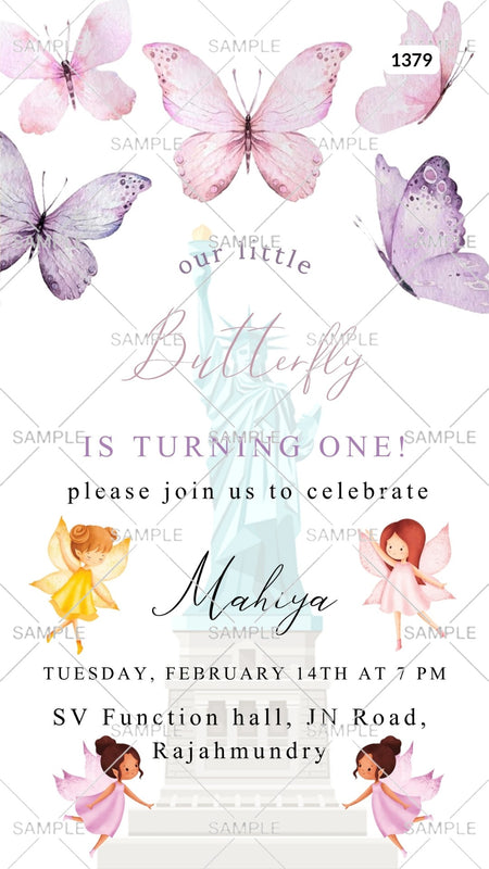 The fairy Theme of 1st Birthday party digital invitation Canva Editable Template for a girl on white background color. This birthday party e-invite editable template is available in the English language. Happy birthday, the invitation includes elements such as the statue of Liberty, butterfly, and fairy. This card design can be customized online for free in Canva, and you can edit the name, date, time, function name and venue. You can also share your card easily via WhatsApp or email.
