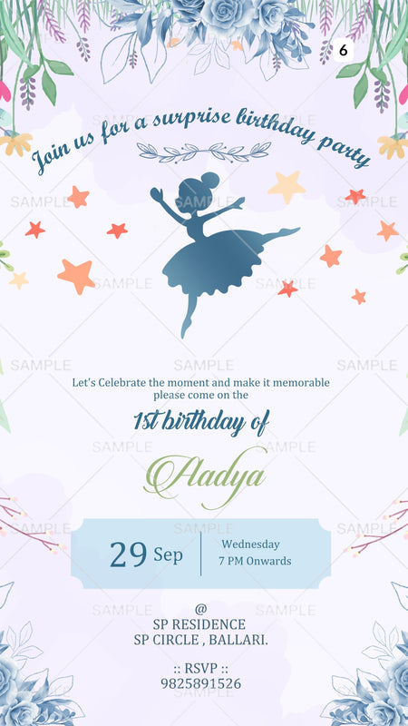The fairy Theme of 1st Birthday party digital invitation Canva Editable for the girl in a pastel purple background color. This birthday party e-invite is available in the English language. Happy birthday, the invitation includes elements such as a girl doodle, green leaves, blue flowers, star. This card design can be customized online for free in Canva, and you can edit the name, date, time, function name and venue. You can also share your card easily via WhatsApp or email.