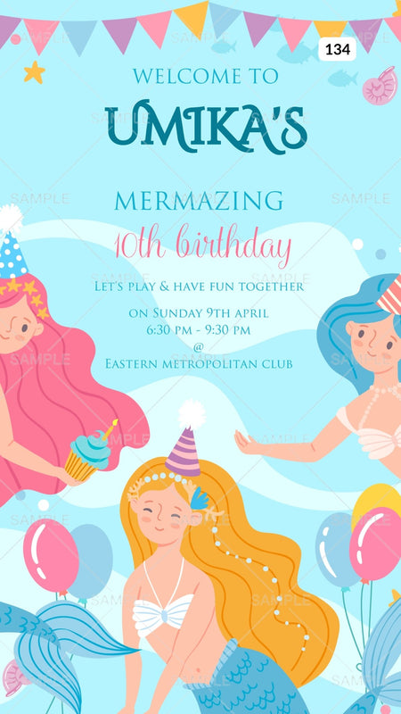 The Under the Sea Theme of the 10th Birthday party digital invitation Canva Editable for girl in sky blue background color. This birthday party e-invite editable template is available in the English language. Happy birthday, the invitation includes elements such as balloons, leaves, mermaid. This card design can be customized online for free in Canva, and you can edit the name, date, time, function name and venue. You can also share your card easily via WhatsApp or email.