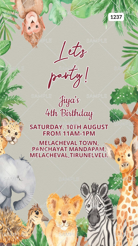 Birthday party invitation card Canva Editable Template in English language with animal as jungle theme design 1237