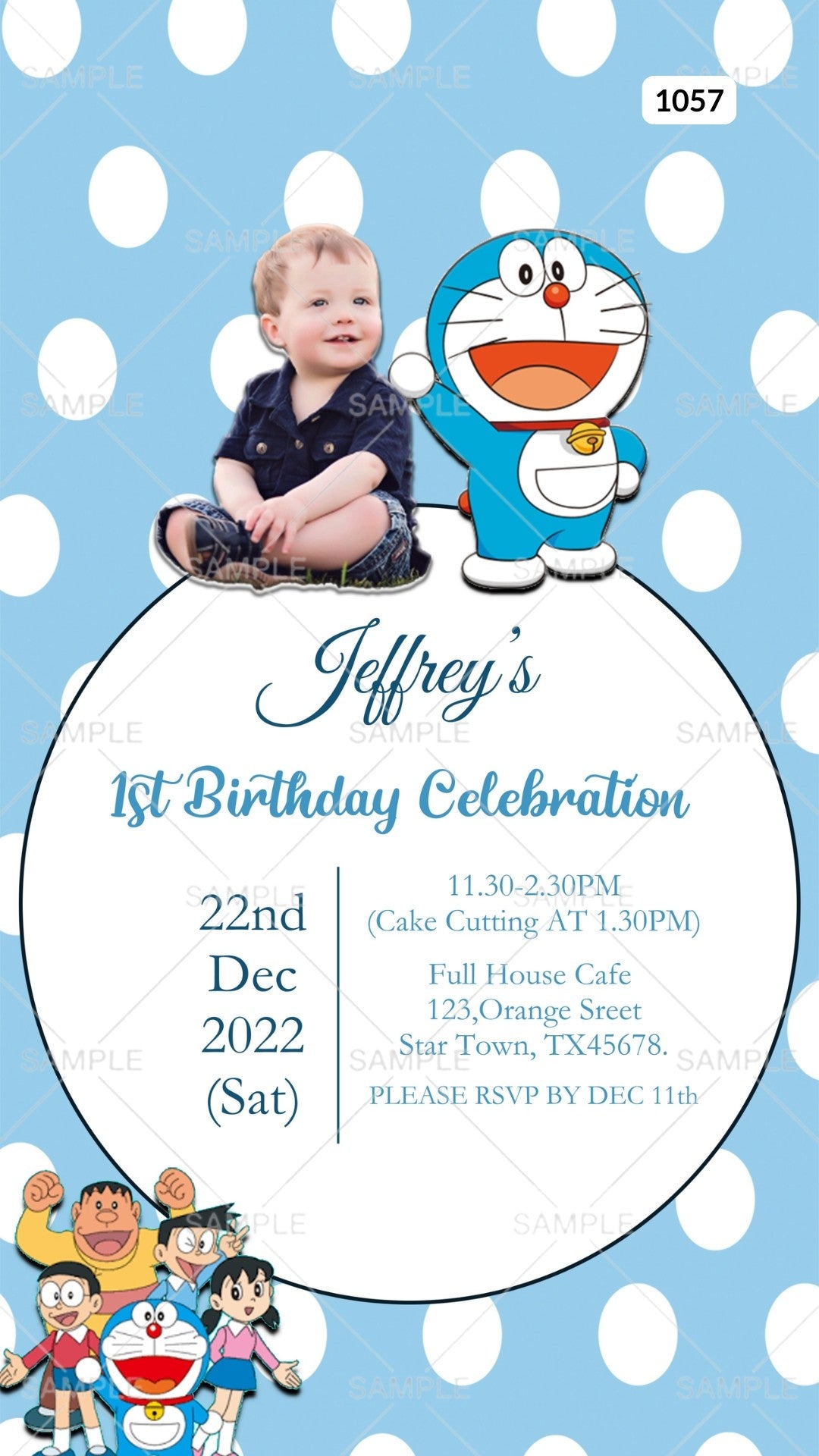 The Doraemon Theme of the 1st Birthday party digital invitation Canva Editable in sky blue background color. This birthday party e-invite editable template is available in the English language. Happy birthday, the invitation includes elements such as a baby image, Doraemon. This card design can be customized online for free in Canva, and you can edit the name, date, time, function name and venue. You can also share your card easily via WhatsApp or email.