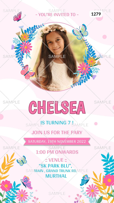 The floral Theme of the 7th Birthday party digital invitation Canva Editable Template in a light pink background color. This birthday party e-invite editable template is available in the English language. Happy birthday, the invitation includes elements such as a frame, butterfly, flowers, and leaves. This card design can be customized online for free in Canva, and you can edit the name, date, time, function name and venue. You can also share your card easily via WhatsApp or email.