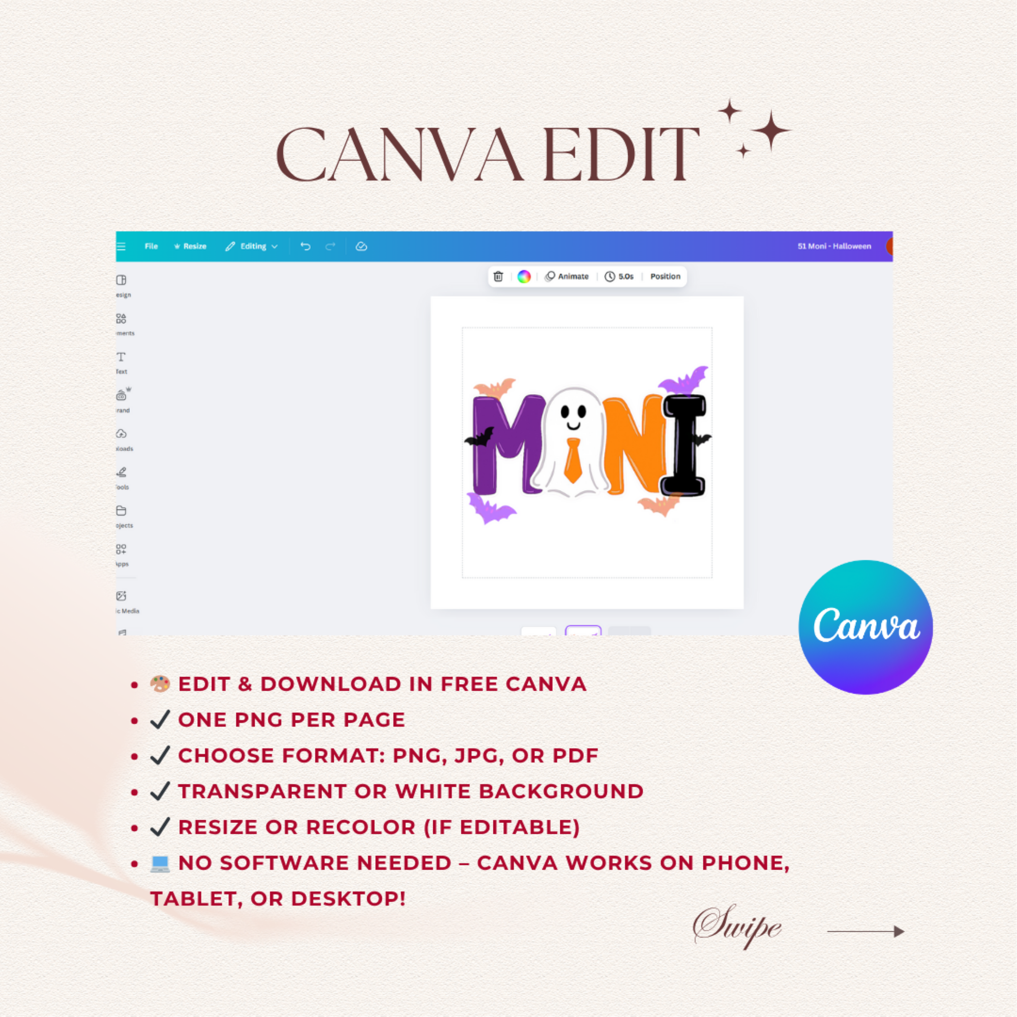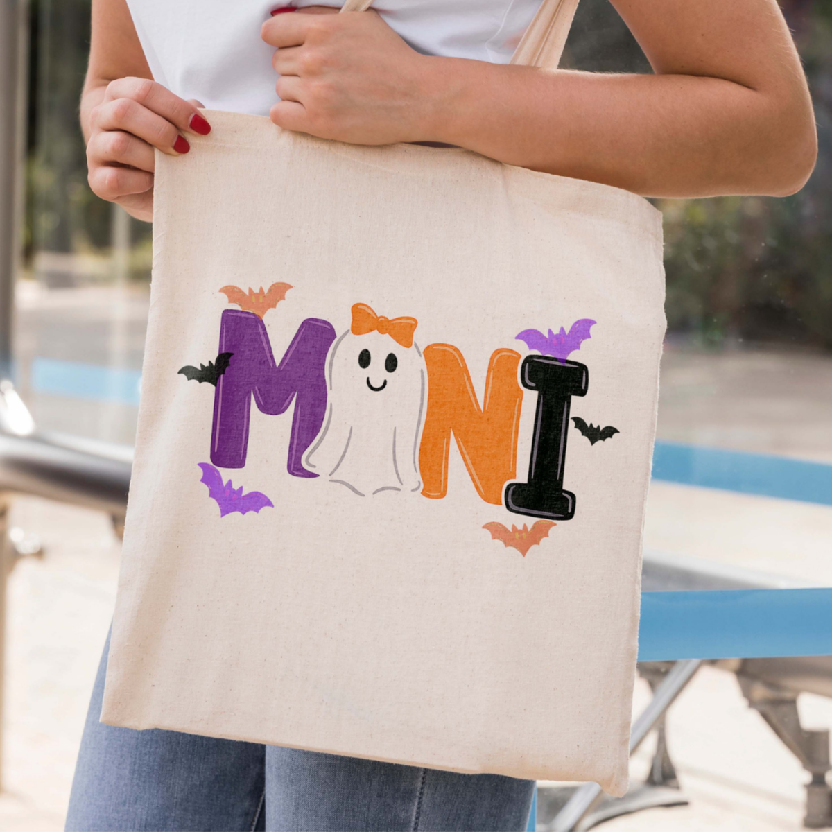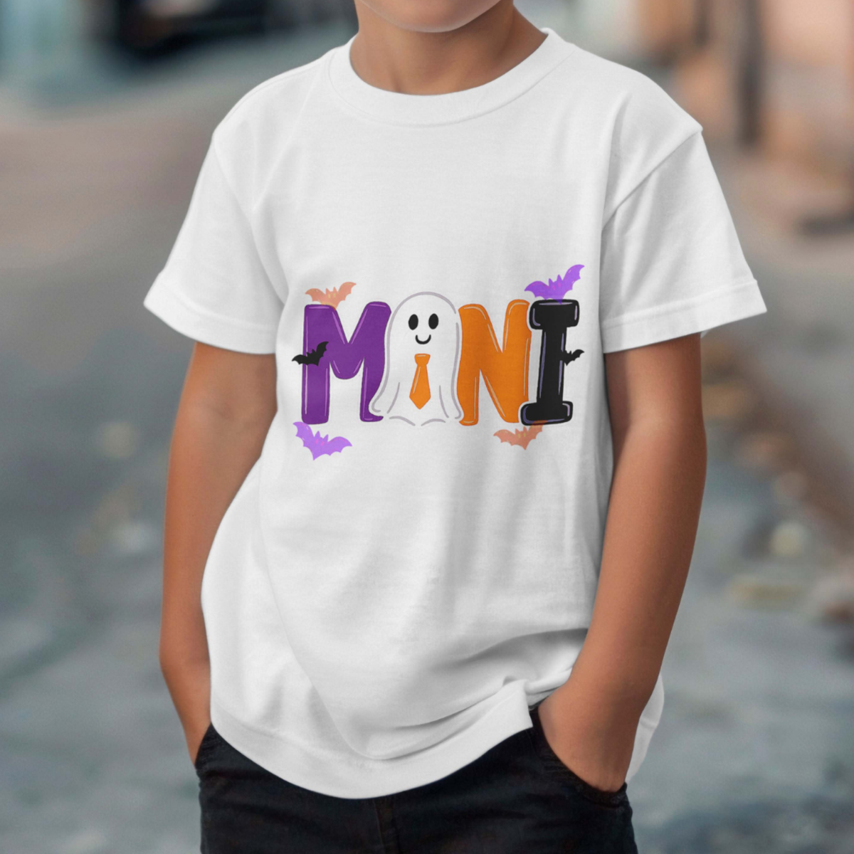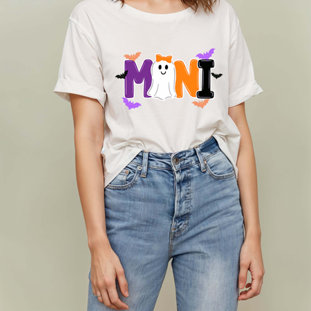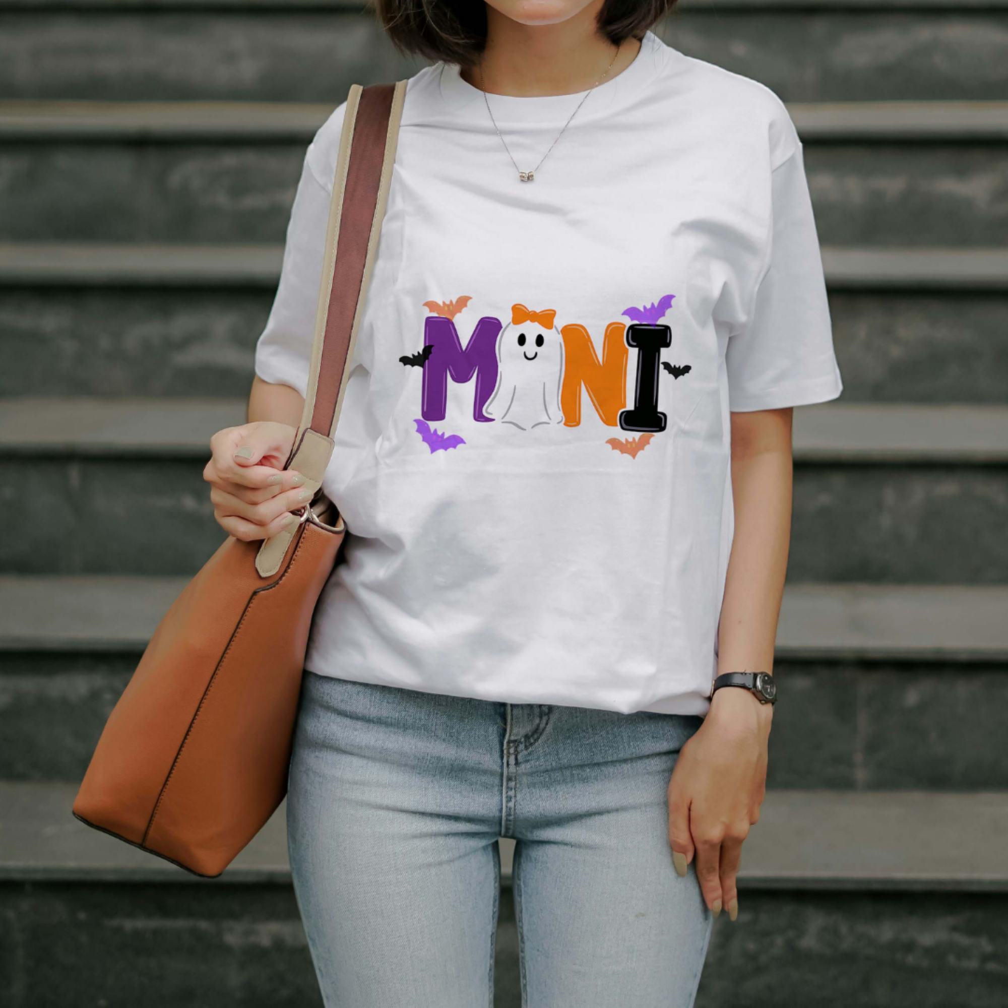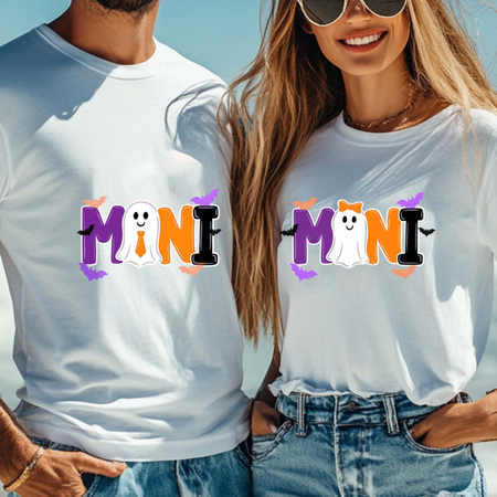 This unique digital collection features 2 high-quality designs that spell out "MINI" with a cute ghost character and bats. Perfect for couples, parents, or friends, these graphics are ideal for creating custom apparel that's both spooky and stylish for the Halloween season.