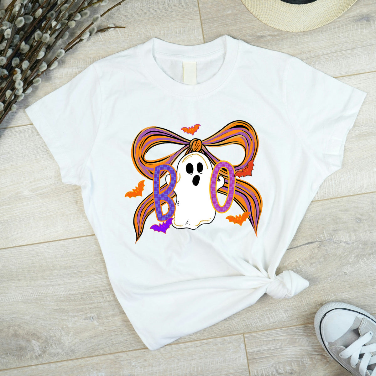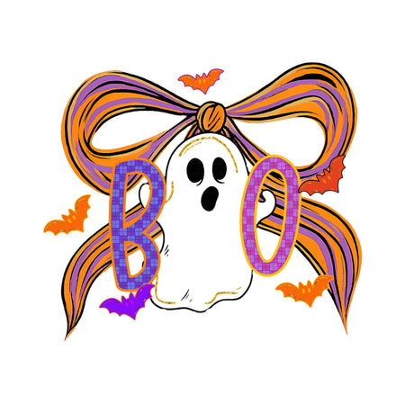 This adorable and trendy digital design features a ghost with a fashionable bow and bats, with the letters "B" and "O" from "Boo" on either side. Perfect for a spooky but cute Halloween, this high-quality PNG is ideal for creating custom apparel, gifts, and decorations that are both festive and fashionable.