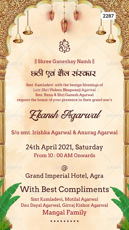 The traditional Theme of the Chhathi Ceremony digital invitation Canva Editable Template in light orange background color. This Chhatti e-invite editable template for available in English language. This Baby Naming card includes elements such as a lantern, arch, Ganesha logo, banana leaves, and bells. This card design can be customized online for free in Canva, and you can edit the name, date, time, function name and venue. You can also share your card easily via WhatsApp or email.