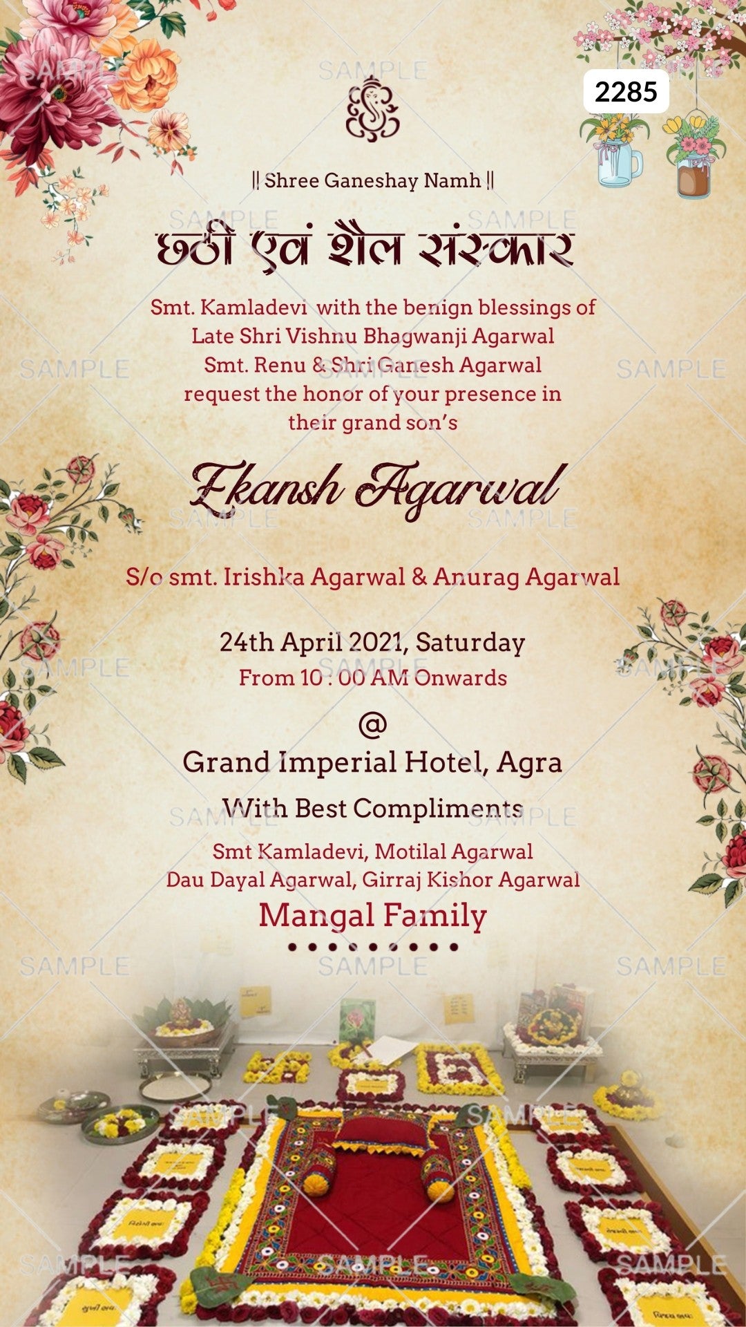 Chhathi ceremony invitation card Canva Editable Template for baby boy and girl in english language with flowers as vintage theme design 2285