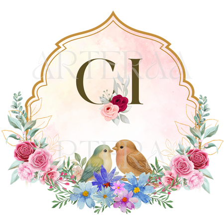 Royal Arch Frame with Love Birds – Luxurious floral arrangement with birds under a Mughal-style arch — perfect for regal invitations.