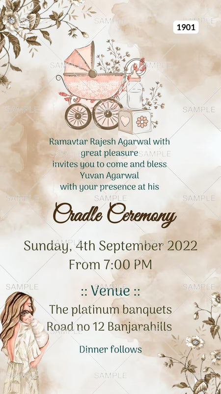 Cradle ceremony invitation card Canva Editable Template for baby boy in english language with cradle, flowers as floral theme design 1901
