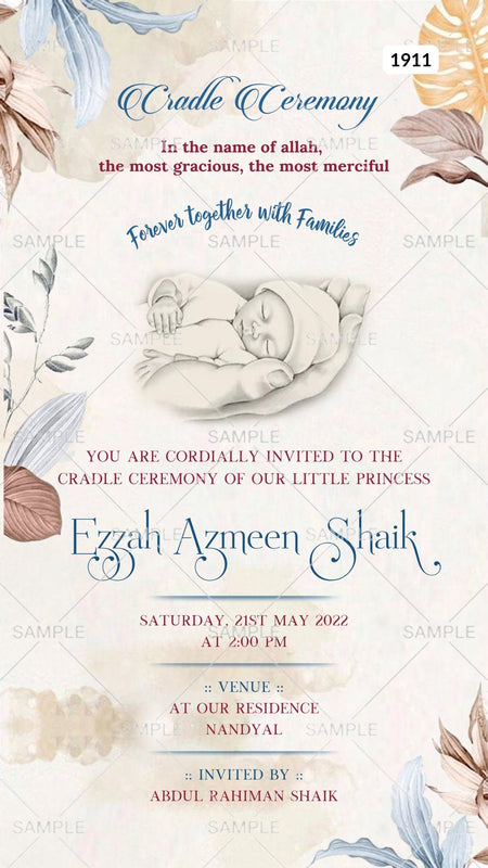 Cradle ceremony invitation card Canva Editable Template for baby girl in english language with leaves as minimalistic theme design 1911