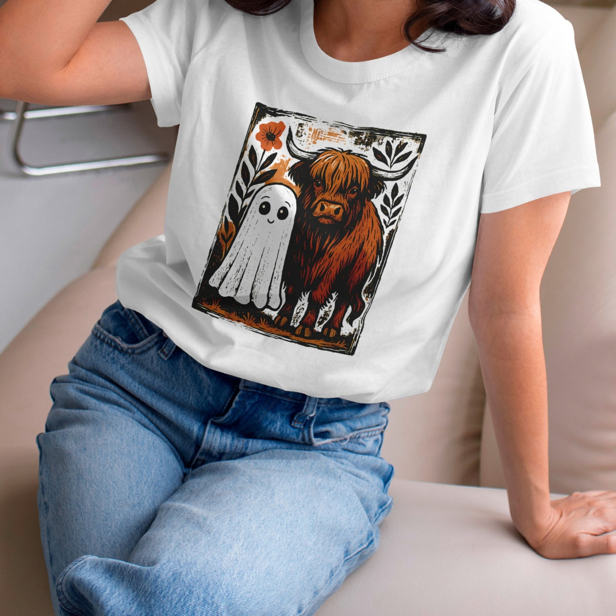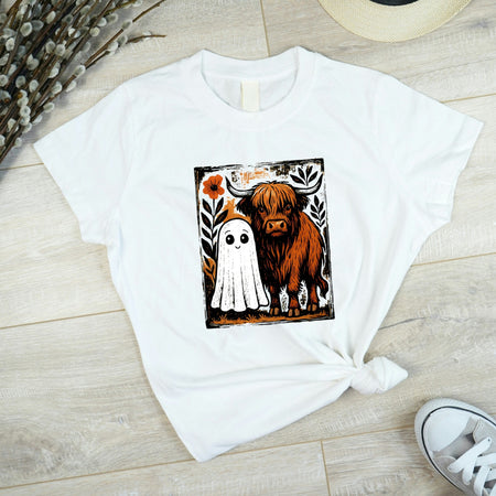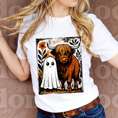 • A cute Highland cow and a friendly ghost graphic