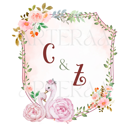Floral Swan Monogram – Gentle pastel pinks, floral frame, and a pair of swans for an elegant romantic vibe.