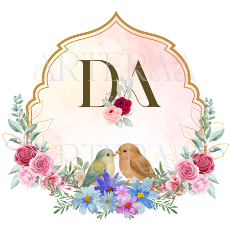 A: You will receive 5 high-resolution PNG files with transparent backgrounds featuring the selected couple initials (e.g., DA). The files are ready to use in digital or printed wedding materials.