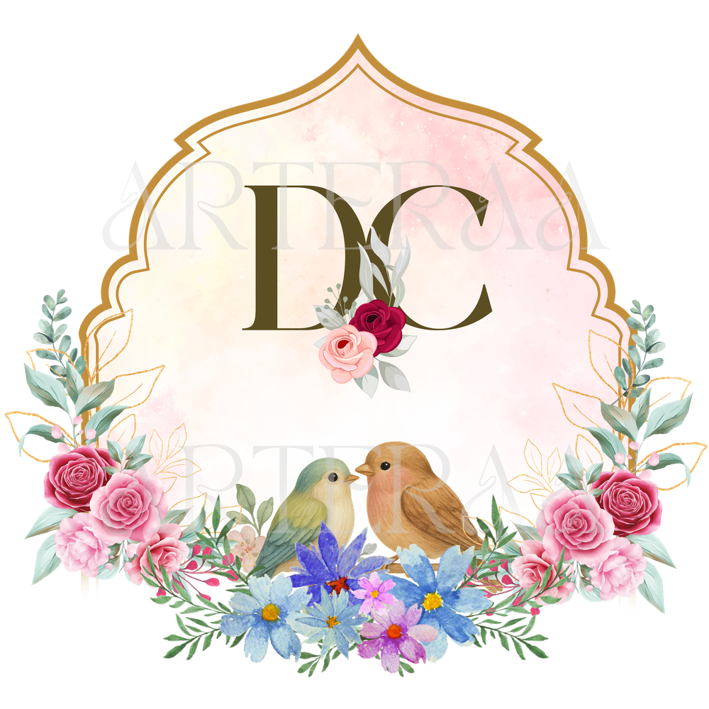 A: You will receive 5 high-resolution PNG files with transparent backgrounds featuring the selected couple initials (e.g., DC). The files are ready to use in digital or printed wedding materials.