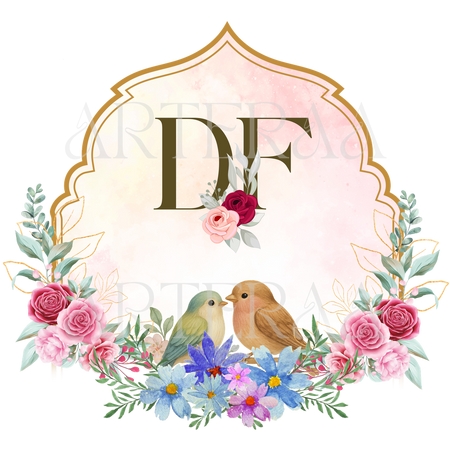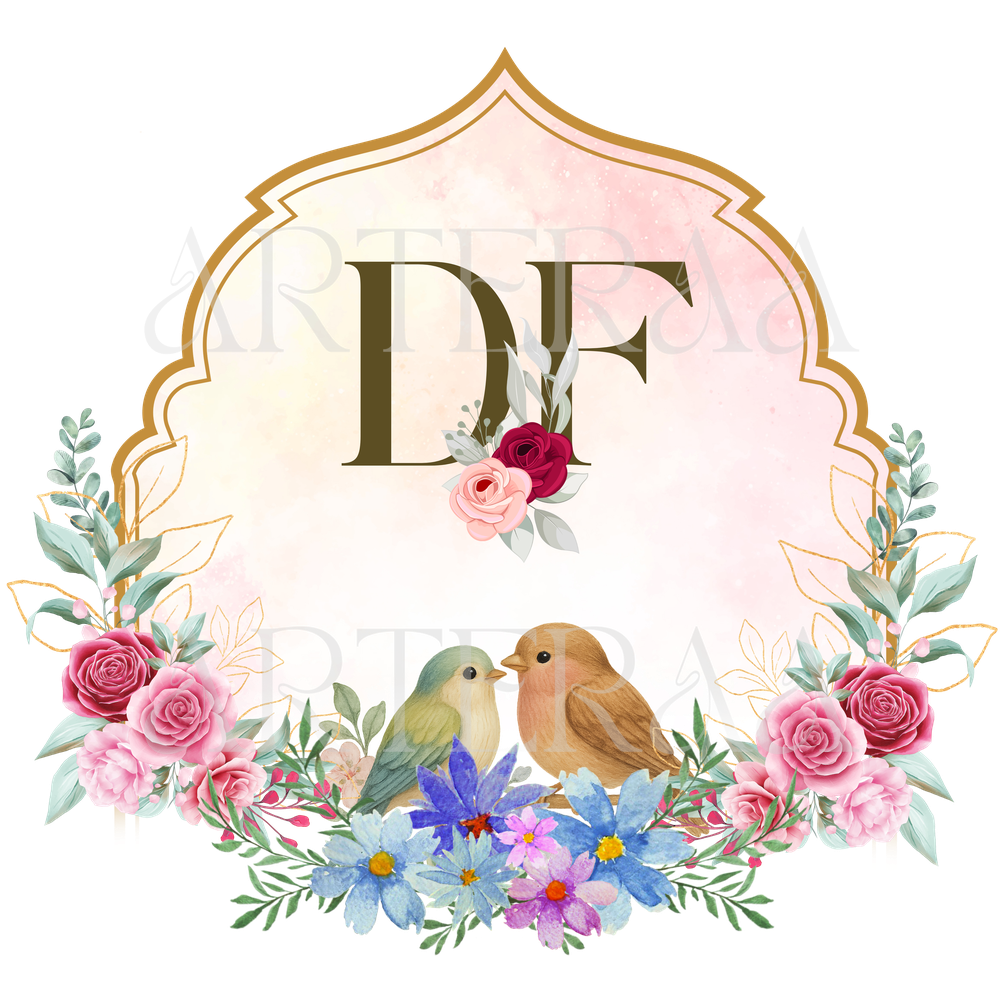 A: You will receive 5 high-resolution PNG files with transparent backgrounds featuring the selected couple initials (e.g., DF). The files are ready to use in digital or printed wedding materials.