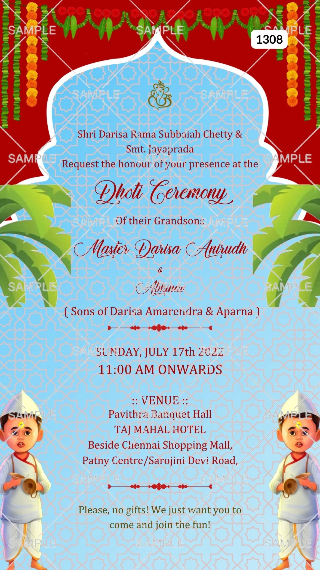 Dhoti ceremony invitation card Canva Editable Template in English language with Arch theme design 1308