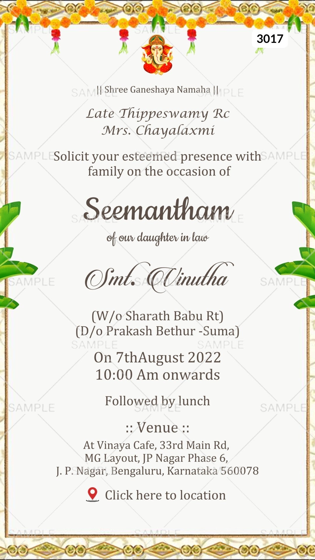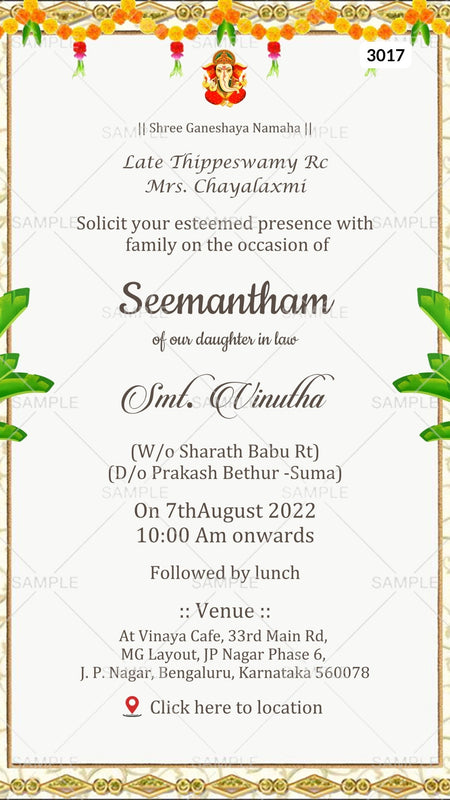 The Indian Traditional theme of the hindu south indian Baby Shower Ceremony Digital Invitation Editable Canva Template in White background color. This e-invite card is perfectly suitable for Telugu families and is available in the English language. It includes elements such as Merigold flowers, leaves, border, ganesh icon This card design can be customized online for free in Canva, and you can edit parents name, date, time, venue.\ You can also share your card easily via WhatsApp or email.
