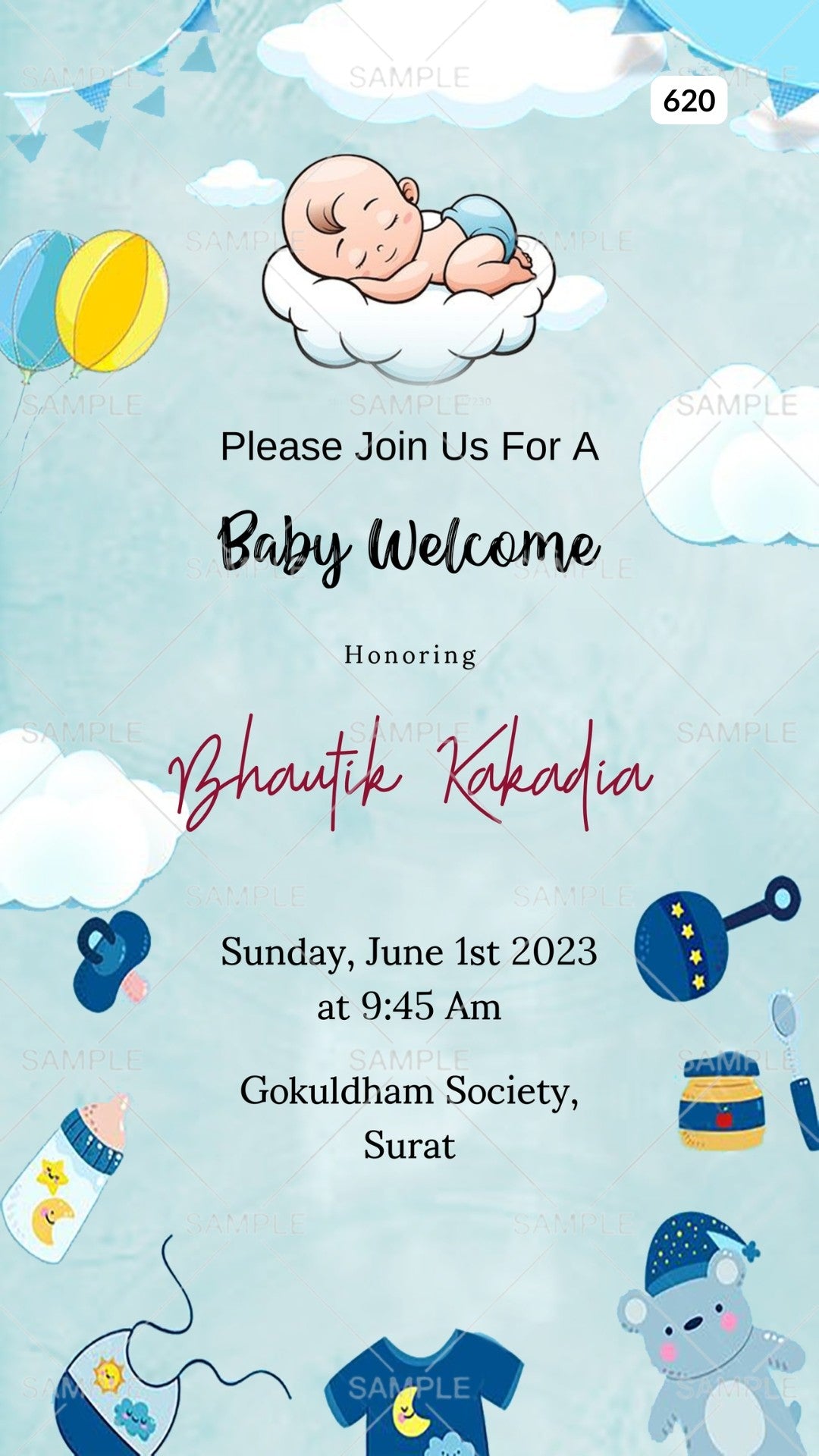 Digital Baby Welcome Ceremony Invitation Of Gujarati Family In English Language With Texture And Playful Theme Canva Editable Template Design no - 620