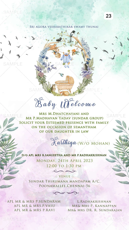 The artistic leaves Theme of the Baby welcome party digital invitation Canva Editable Template in green splash background color. This baby welcome e-invite editable template is available in the English language. Baby welcome party invitation card includes elements such as birds, a cradle, green leaves, clothes, a cat, frame. This card design can be customized online for free in Canva, and you can edit the couple's name, date, time, function name and venue. You can also share your card easily via WhatsApp or email.