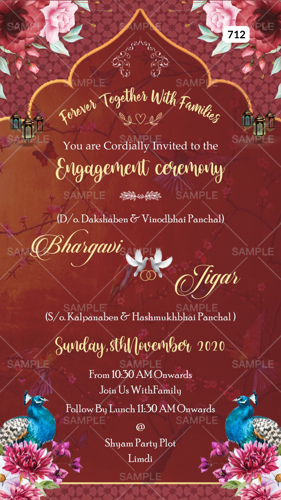 The Floral and Arch Theme of the hindu Indian Engagement Ceremony Digital Invitation Canva Editable in Brown background color. This e-invite card is perfectly suitable for Gujarati families and is available in the English language. It includes elements such as flowers, leaves, peacock, lantern, birds, heart, ring This card design can be customized online for free in Canva, and you can edit couple name, parents name, date, time, venue. You can also share your card easily via WhatsApp or email.