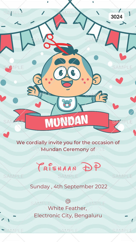 Digital Mundan Ceremony Invitation Of South Indian Family In English Language With Pastel Blue and Red Disney Theme Canva Editable Template Design No. 3024