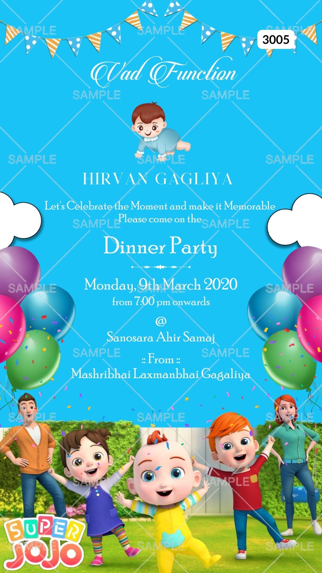 The Playful theme of the hindu Indian Vad Function Digital Invitation Editable Canva Template in Blue background color. This e-invite card is perfectly suitable for Gujarati families and is available in the English language. It includes elements such as baby doodle, balloon, grass This card design can be customized online for free in Canva, and you can edit Baby name, date, time, venue, From. You can also share your card easily via WhatsApp or email.